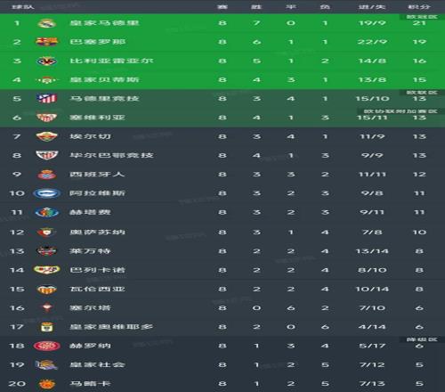 北京时间10月6日,西甲第8轮随着巴萨1-4惨败塞维利亚,西班牙人1-2不敌皇家贝蒂斯,皇家社会0-1巴列卡诺,塞尔塔1-1马竞的比赛结束,最新积分榜如下!