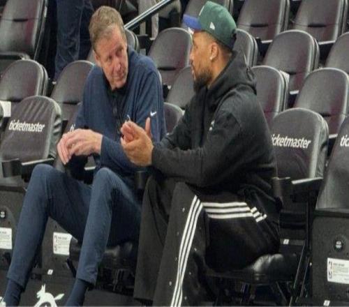赛前,勇士助教斯托茨和开拓者球员利拉德在场边聊天。两人曾在2012-2021期间于开拓者共事9年。