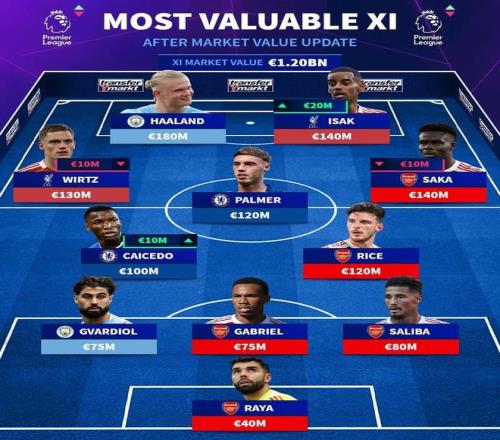 萨卡(阿森纳)1.4亿欧元、赖斯(阿森纳)1.2亿欧元、帕尔默(切尔西)1.2亿欧元、莫伊塞斯-凯塞多(切尔西)1亿欧元、维尔茨(利物浦)1.3亿欧元