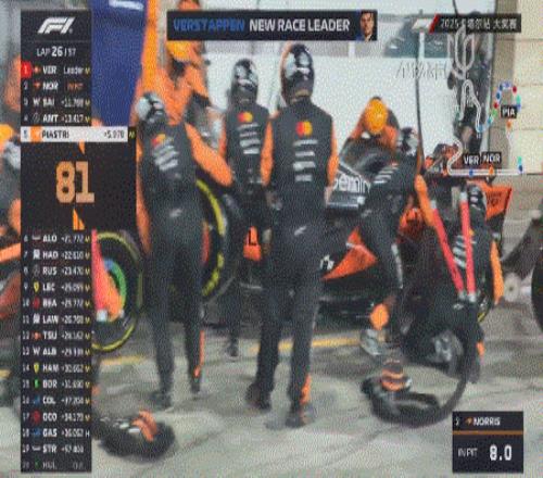 来到21圈,皮亚斯特里通过TR向车队表示自己的左前胎已经有些挣扎了!第24圈,皮亚斯特里进站换胎耗时3.1秒,出站后排在阿隆索身前,处于当时的第5名(因为诺里斯还未进站)!