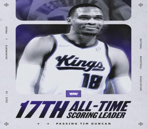 在上半场比赛中,威少8投3中得到了8分2篮板5助攻,他也在NBA历史总得分帮上超越了蒂姆-邓肯(26496分),升至历史得分榜第17位。