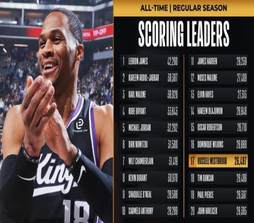 在威少身前的是“人类电影精华”多米尼克-威尔金斯,后者目前领先威少不到200分,威少完成超越也是唾手可得。