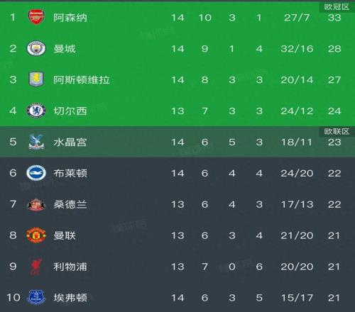 英超积分榜,阿森纳20,5分领跑,维拉让二追四,4连胜攀升第三
