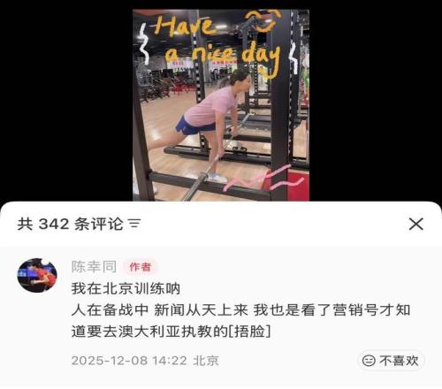 12月8日,中国乒乓球队队员陈幸同在社交平台辟谣赴澳大利亚执教传闻。她表示自己正在北京训练,“人在备战中,新闻从天上来。我也是看了营销号才知道要去澳大利亚执教的。”