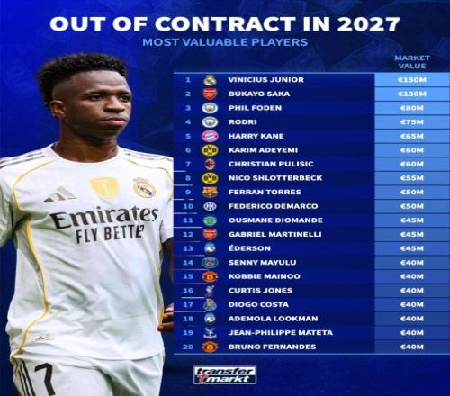 以下是2027年合同到期球员身价前20名的名单:
