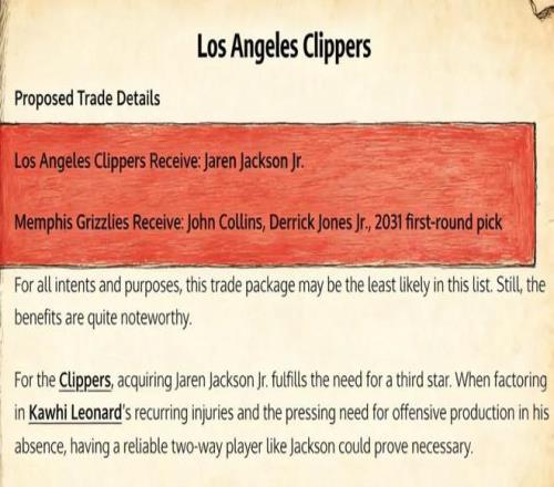 美媒《Fadeaway World》撰文建议,快船可以考虑将科林斯、小琼斯以及2031年的首轮签送到灰熊,引入小杰克逊