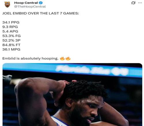 值得一提的是,恩比德本场的表现并非灵光一闪,而是1月份以来火爆表现的缩影。