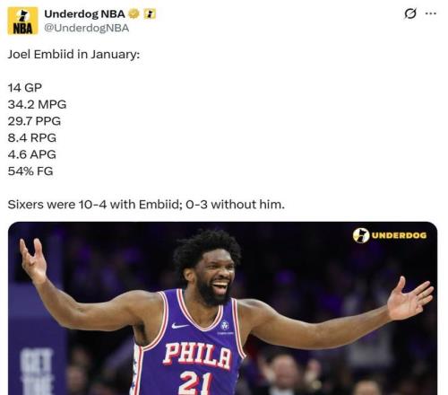 1月份恩比德在出战的14场比赛中,场均轰下29.7分8.4板4.6助全能表现,命中率54%,率队拿下10胜4负战绩,而在其缺席的3场比赛中,76人队0胜3负。