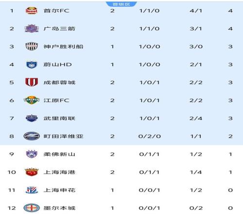 最新积分榜方面,均取得1胜1平的首尔FC和广岛三箭同积4分,首尔FC凭借净胜球优势暂时排在第1,广岛三箭暂居第2。