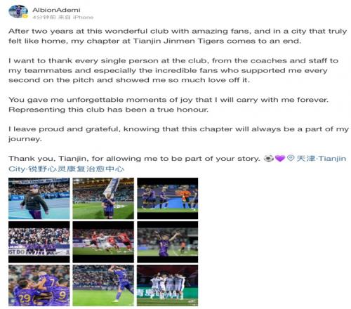 阿代米告别津门虎表达对球队的感激与珍贵回忆_中超直播