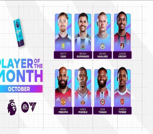 北京时间10月30日,英超官方公布了10月最佳球员的候选名单,其中哈兰德、姆伯莫、廷贝尔、吉马良斯、卡什等多人在列。英超10月最佳球员候选:卡什(维拉) 3场比赛全胜 1球1零封吉