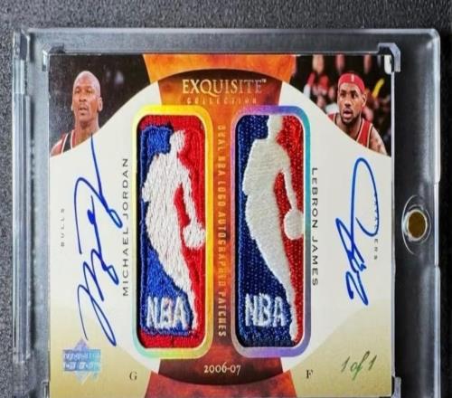 北京时间10月18日,据美国媒体报道,本周又有两张罕见的NBA球星卡以创纪录价格成交。首先亮相的是2006-07赛季Upper Deck Exquisite收藏系列乔丹、詹姆斯双人Logoman 1of1球星卡