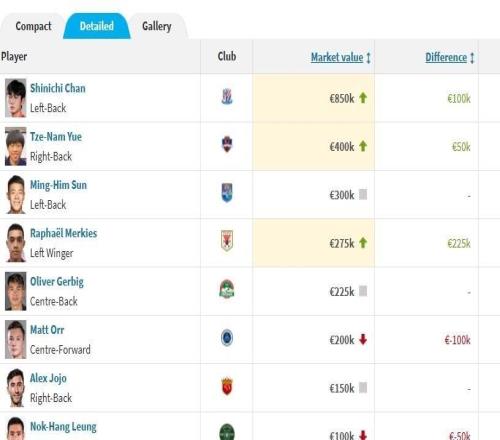 北京时间12月17日,转会市场网公布了中超联赛球员的最新身价,在港台球员中,效力成都蓉城的周定洋以100万欧元身价居首。德转中超联赛中国香港球员身价榜陈晋一(上海申花)85万欧元