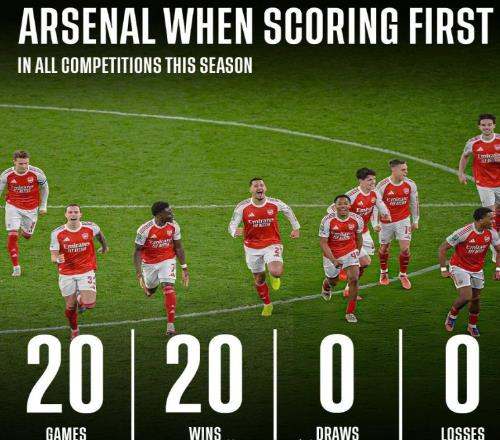 作为本赛季到目前为止,欧洲五大联赛中表现最为出色的队伍,阿森纳队的赢球秘诀被媒体和球迷们所发现。那就是根据技术统计,本赛季阿森纳在各项赛事中,只要率先取得进球,那么枪手就