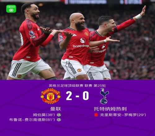 北京时间2月7日英格兰足球顶级联赛第25轮,曼联主场对阵托特纳姆热刺。上半场,罗梅罗因踩踏动作吃到红牌,之后姆伯莫破门。下半场,布鲁诺-费尔南德斯再下一城。最终比分曼联2-0热