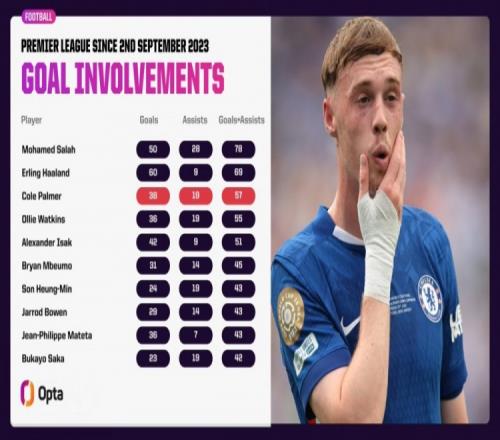 帕尔默加盟切尔西后英超参与57球排名仅次于萨拉赫和哈兰德_英超直播免费观看